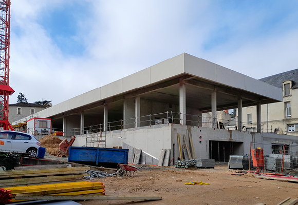 Le chantier du pôle Malraux (MOA: Université de Poitiers) vient de franchir une étape décisive avec l’achèvement du gros-œuvre et le départ de la grue. Comprenant deux niveaux d’infrastructure dédiés au stationnement et aux stockages archéologiques et un niveau émergeant réunissant un ensemble de salles de conférences et d’exposition, le bâtiment a nécessité des fondations spéciales en raison de la topographie marquée et du programme. Le couronnement du volume émergeant est composé de modules de béton préfabriqué afin de réduire le temps de pose et garantir la qualité des ouvrages, compte-tenu de la morphologie complexe. Cette casquette marque la composition horizontale de l’émergence et assure également une protection solaire. La toiture est formée de dalles alvéolaires précontraintes (DAP) pour franchir les grandes portées. L’ensemble est construit au droit des bâtiments adjacents datant des XVIIIe et XIXe siècles, nécessitant un soin particulier dans l’implantation. En complément, les façades de l’ancienne Ecole de Médecine du XVIIIe siècle rue de l’Hôtel-Dieu ont été ravalées et les fenêtres remplacées, dans le respect des techniques patrimoniales traditionnelles. Livraison prévue rentrée 2026!