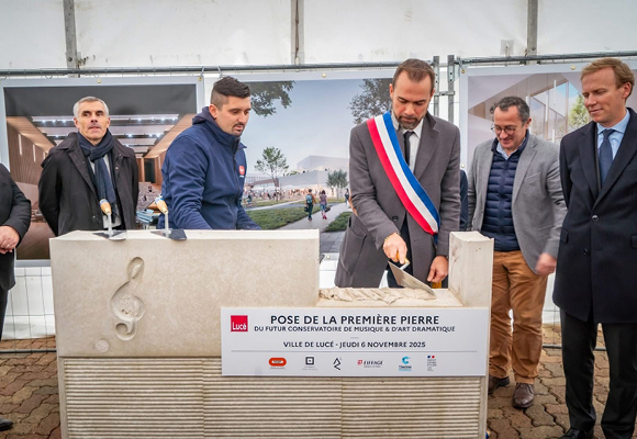La première pierre du conservatoire de musique et d’arts dramatiques de Lucé a été posée aujourd’hui en présence notamment de Florent Gauthier, maire de la ville, de la SPL Chartres Aménagement, Bouygues Construction et des membres du groupement de maîtrise d’œuvre.