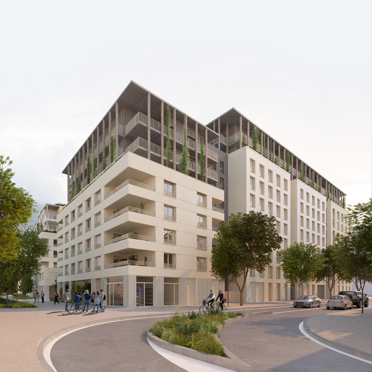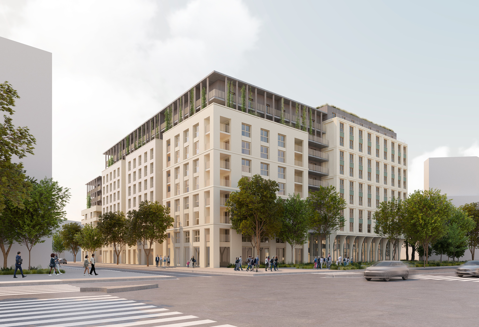 Construction neuve d’un îlot à usage mixte regroupant une résidence étudiante de 140 chambres, 164 logements collectifs (libres et sociaux), 1 crèche et 2 commerces, avec un parking en sous-sol