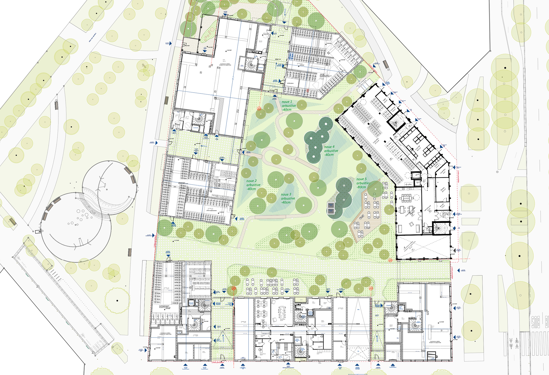 Regroupant des logements, une résidence étudiante, une crèche, des commerces, du stationnement, le programme, varié et conséquent, se répartit en plusieurs volumes autour d’un cœur d’îlot central paysagé.