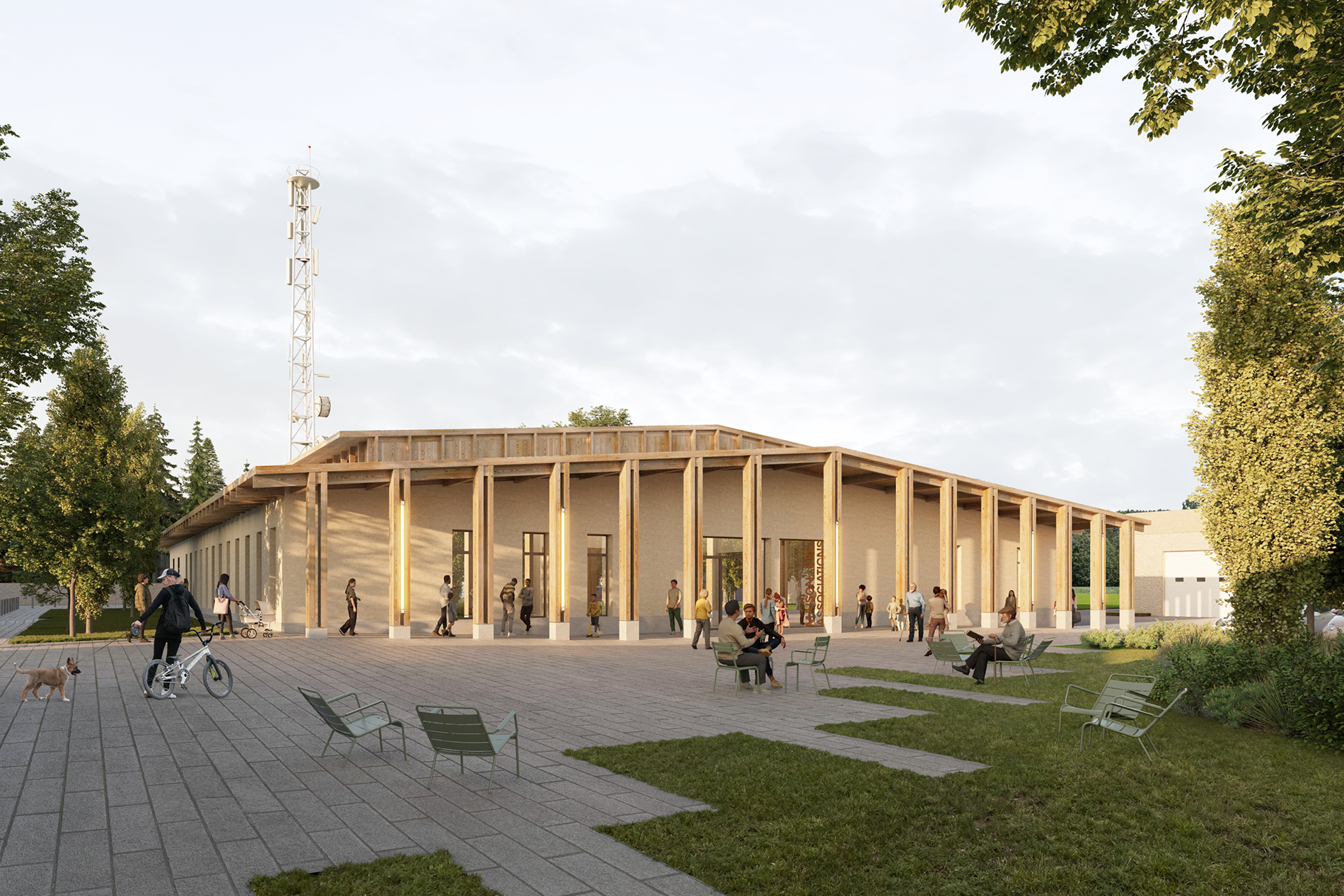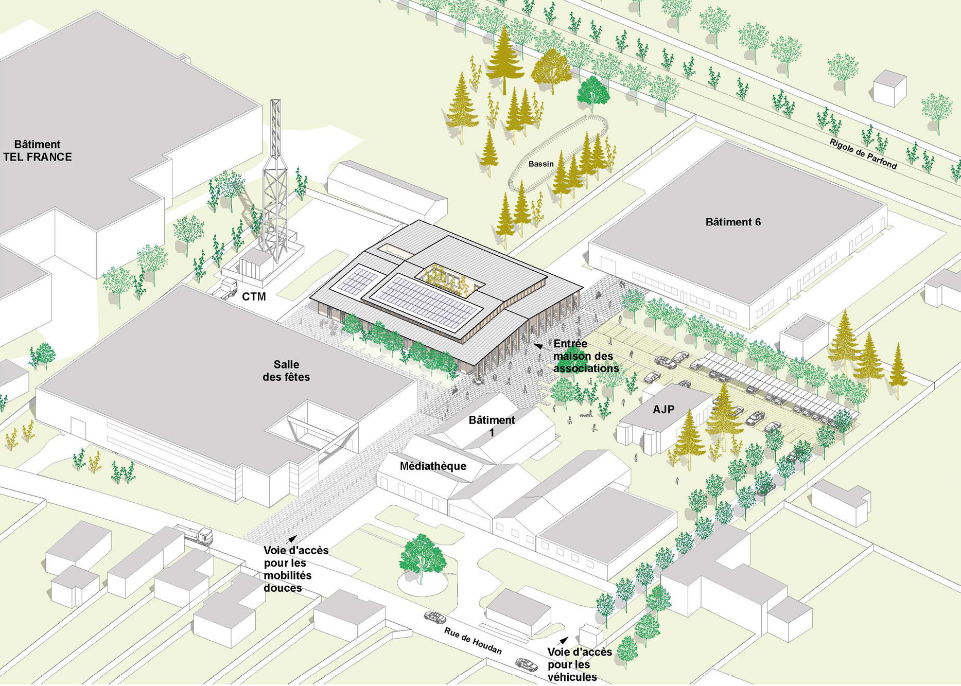 Par son programme et son emplacement, la Maison des Associations vient compléter le pôle d’équipements publics de proximité déjà présents sur le site. Un nouveau parvis renforcera ces liens et pourra accueillir des événements ponctuels.