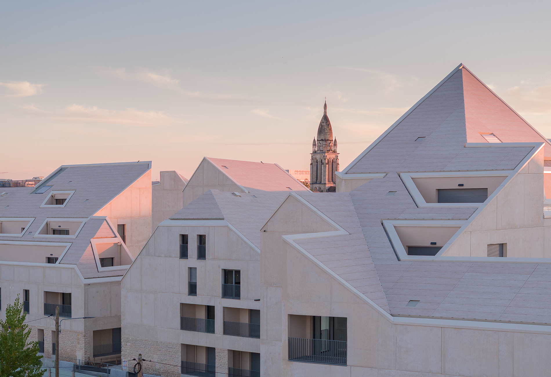 Au sein de la ZAC Bastide Niel à Bordeaux, le projet des 65 logements conçu avec OLGGA pour CA Immobilier s’efforce de concrétiser le plus fidèlement possible les préceptes architecturaux et urbains définis par MVRDV : effet de monolithe, continuité plastique, gabarits ciselés pour assurer un ensoleillement maximal. Formant un archipel, les six bâtiments intègrent dans les façades en béton les murs d’enceinte en pierre massive de l’ancienne caserne militaire, sans appui structurel, créant une enveloppe à la fois mixte et continue. Aujourd’hui disparus, les sheds sont évoqués par un changement de teinte de béton dans certains soubassements, à la façon d’un palimpseste.