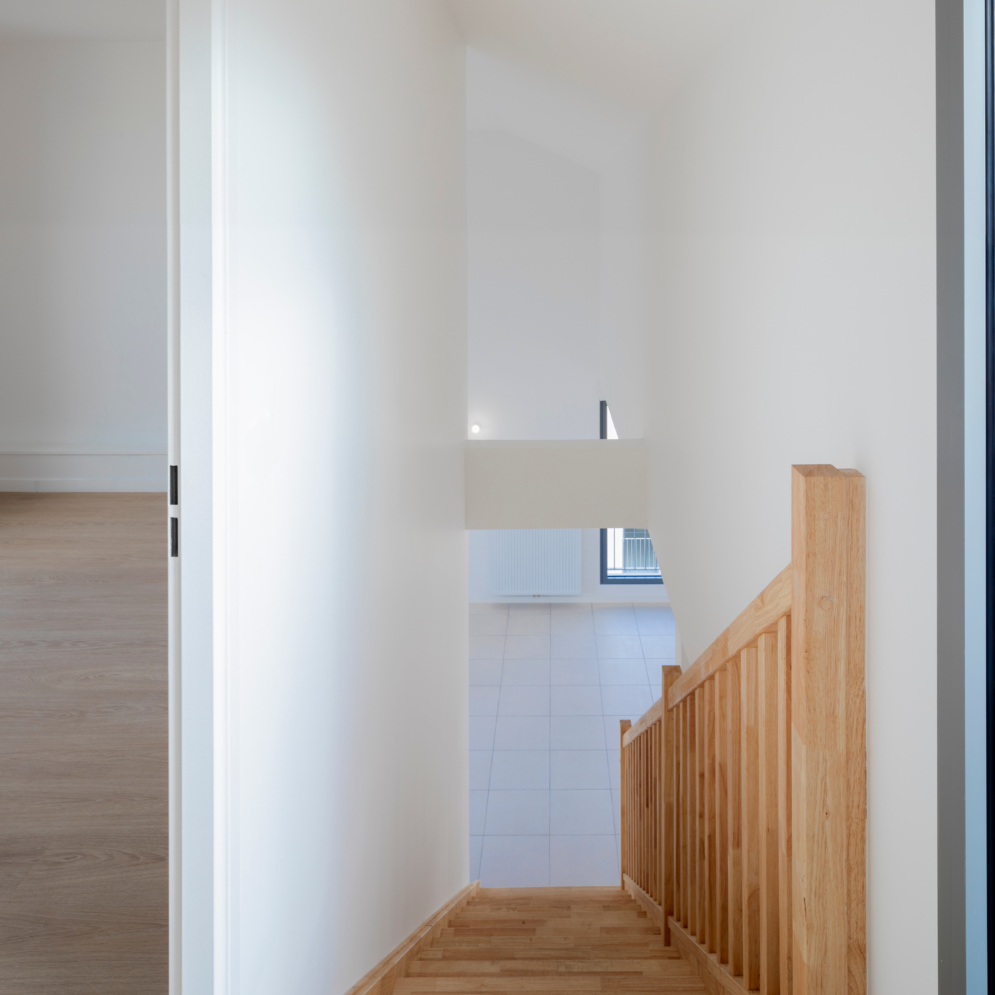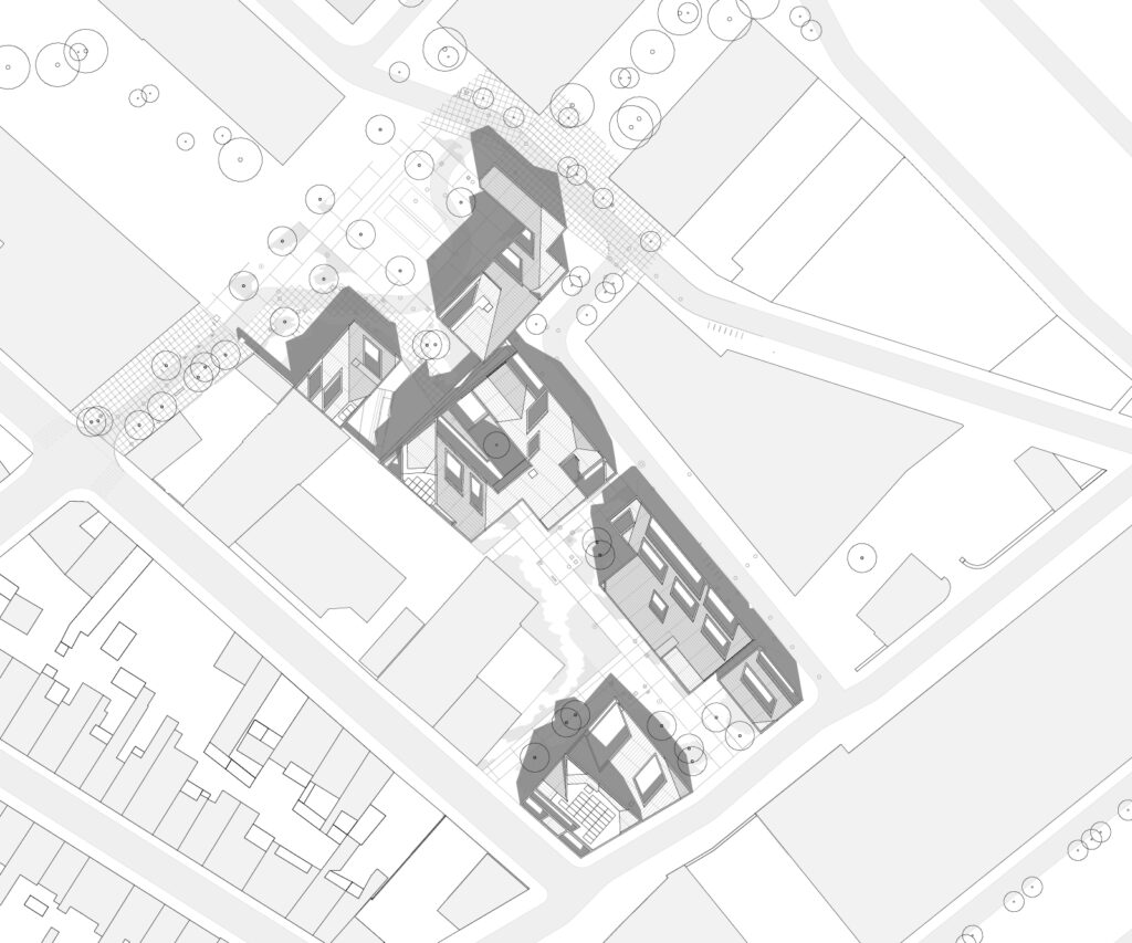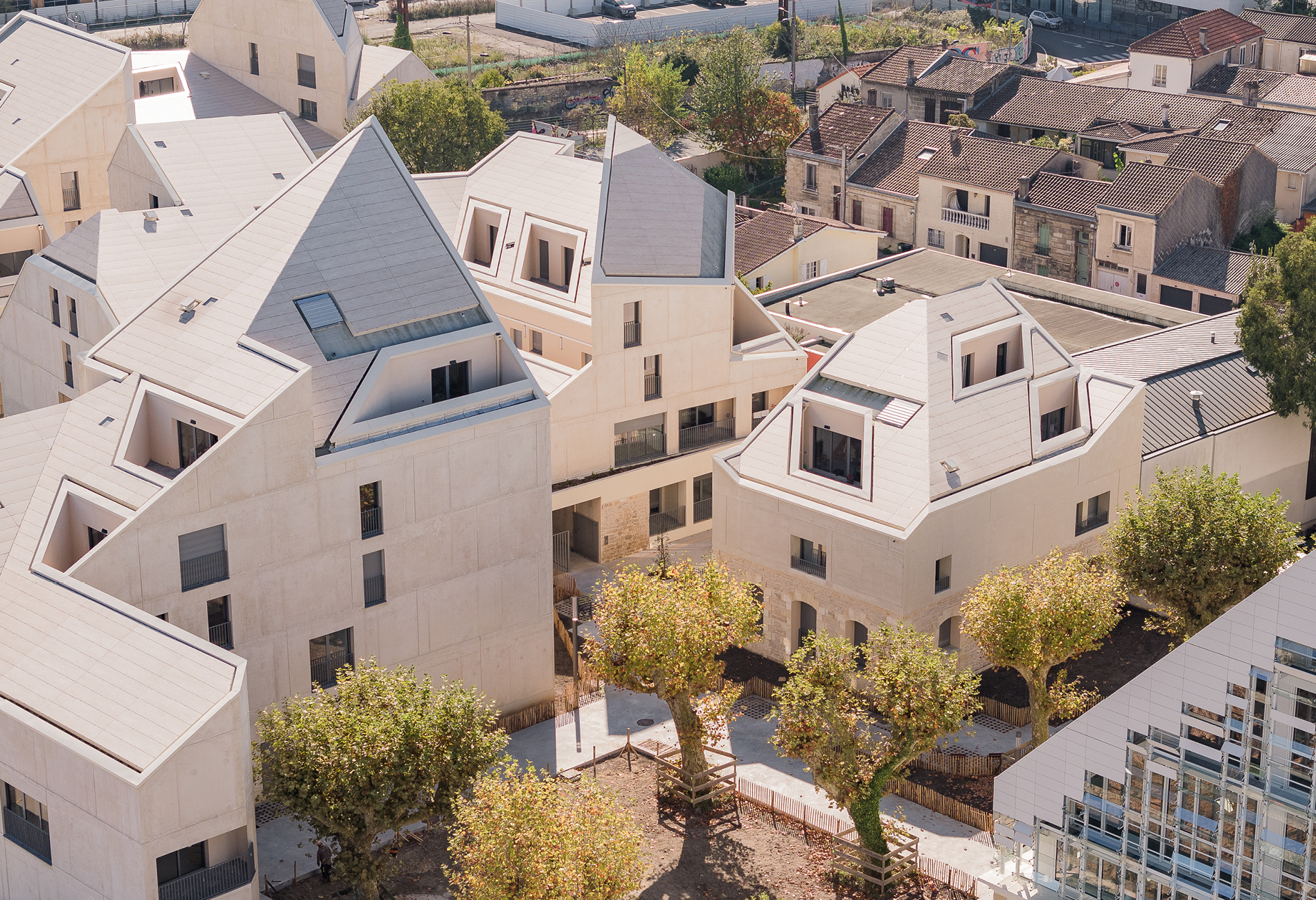 La volumétrie du bâtiment sera achevée avec l’intervention des couvreurs et charpentiers. Pour traduire l’effet d’enveloppe continue entre mur et toiture (matérialité et coloris), nous avons eu recours à un procédé de couverture nouveau, avec l’emploi pour la couverture d’une céramique innovante classiquement posée en façade. Les logements sont répartis dans un archipel de bâtiments, disposition qui a amplifié la complexité du chantier.