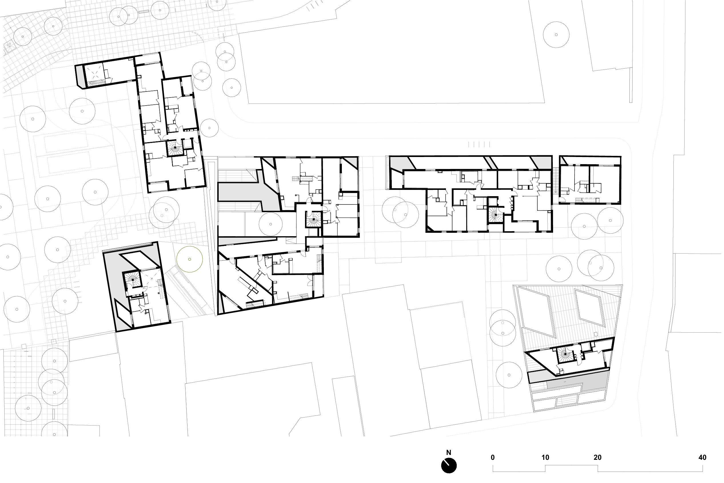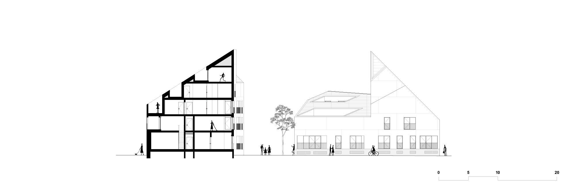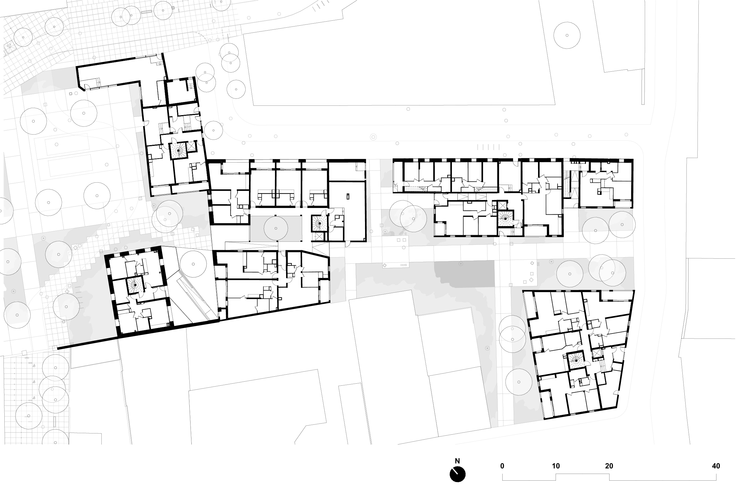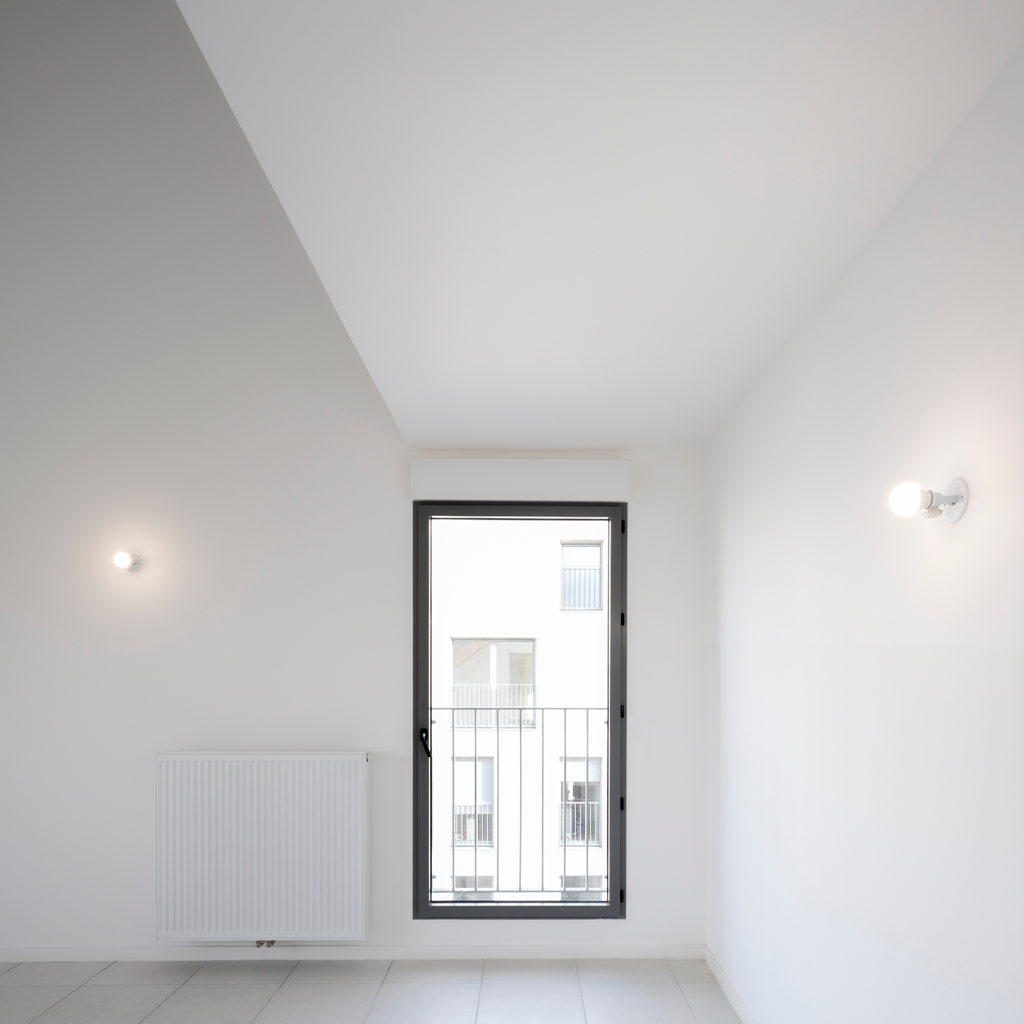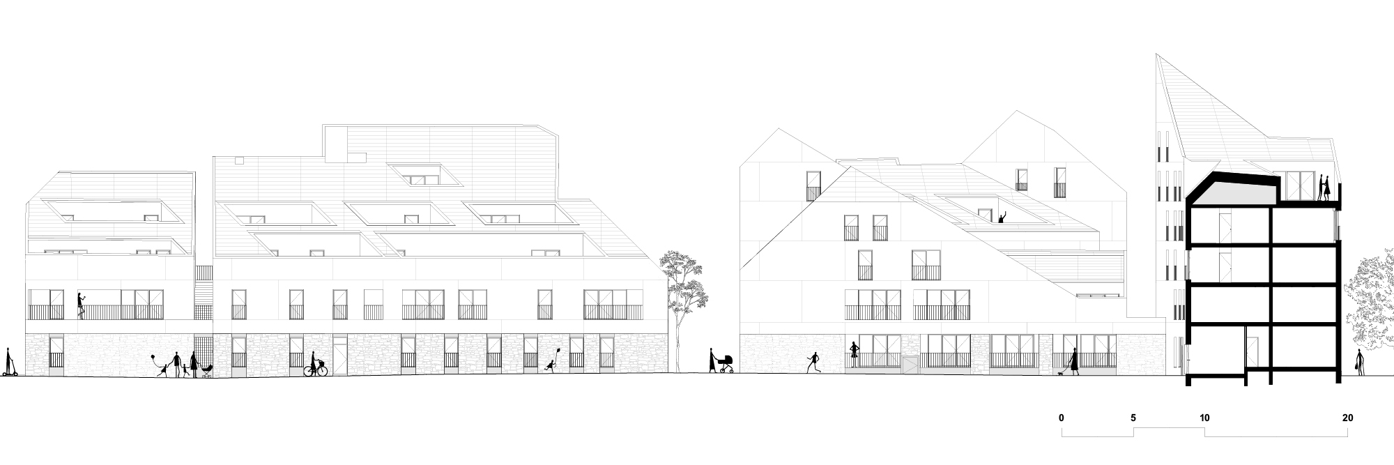 Les logements sont distribués dans un archipel de six bâtiments, dont l’implantation et le dimensionnement composent notamment avec le passage des eaux souterraines. Le bâti intègre également dans les façades en béton les murs d’enceinte en pierre massive de l’ancienne caserne militaire, sans appui structurel, créant une enveloppe à la fois mixte et continue. Aujourd’hui disparus, les sheds sont évoqués par un changement de teinte de béton dans le soubassement de certains des six bâtiments, à la façon d’un palimpseste.