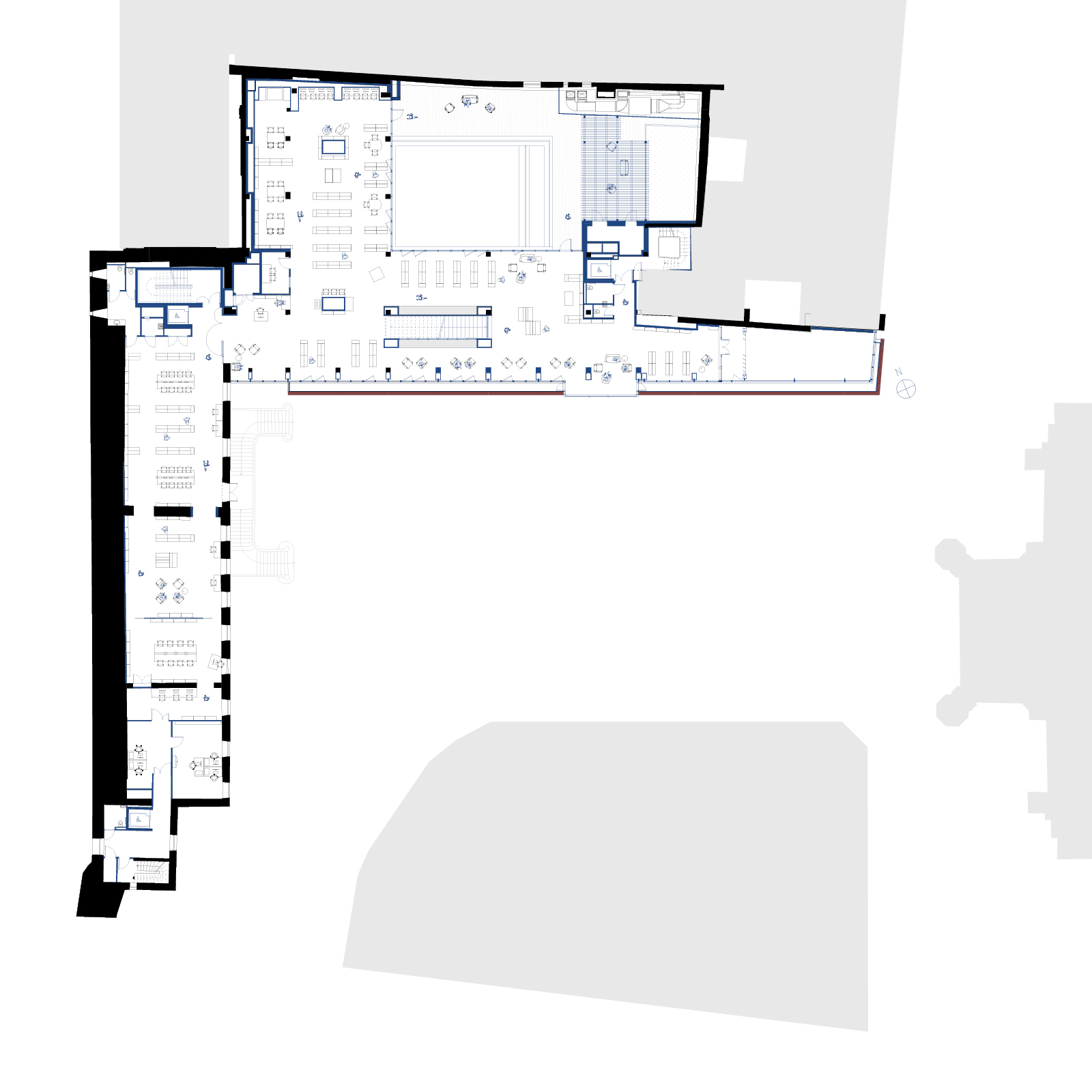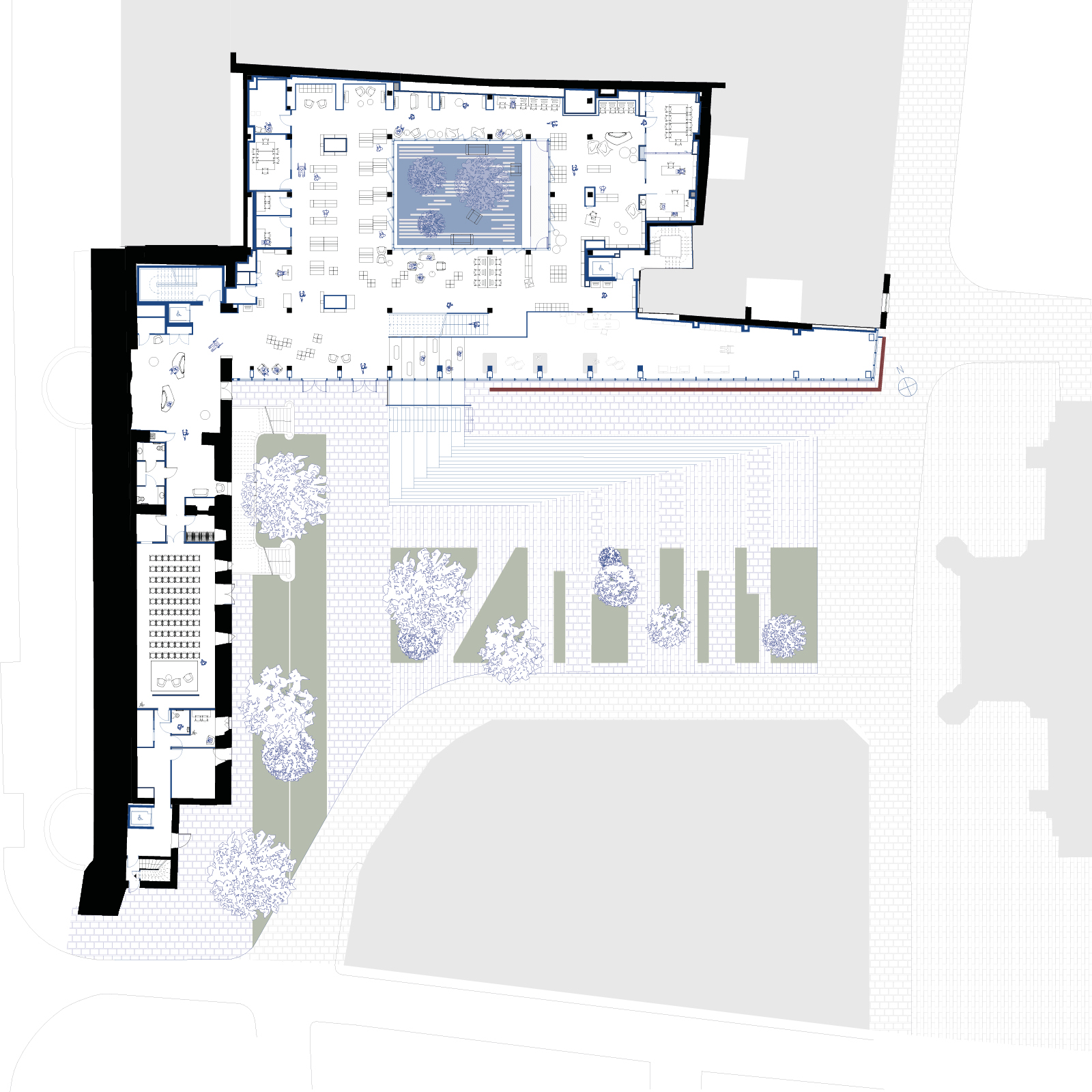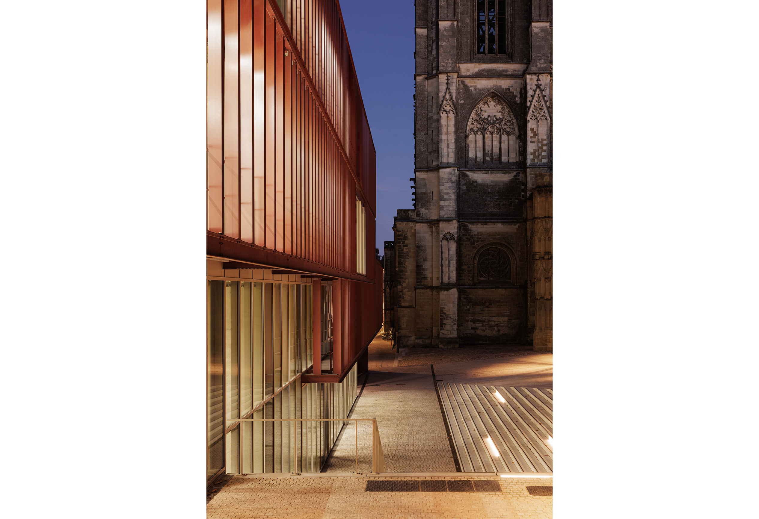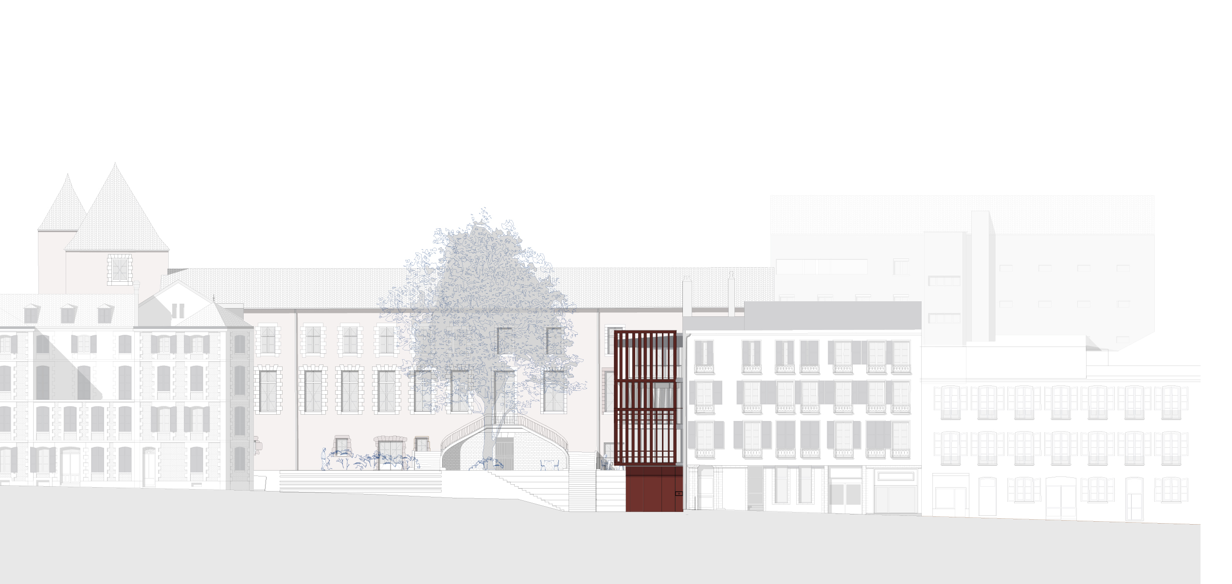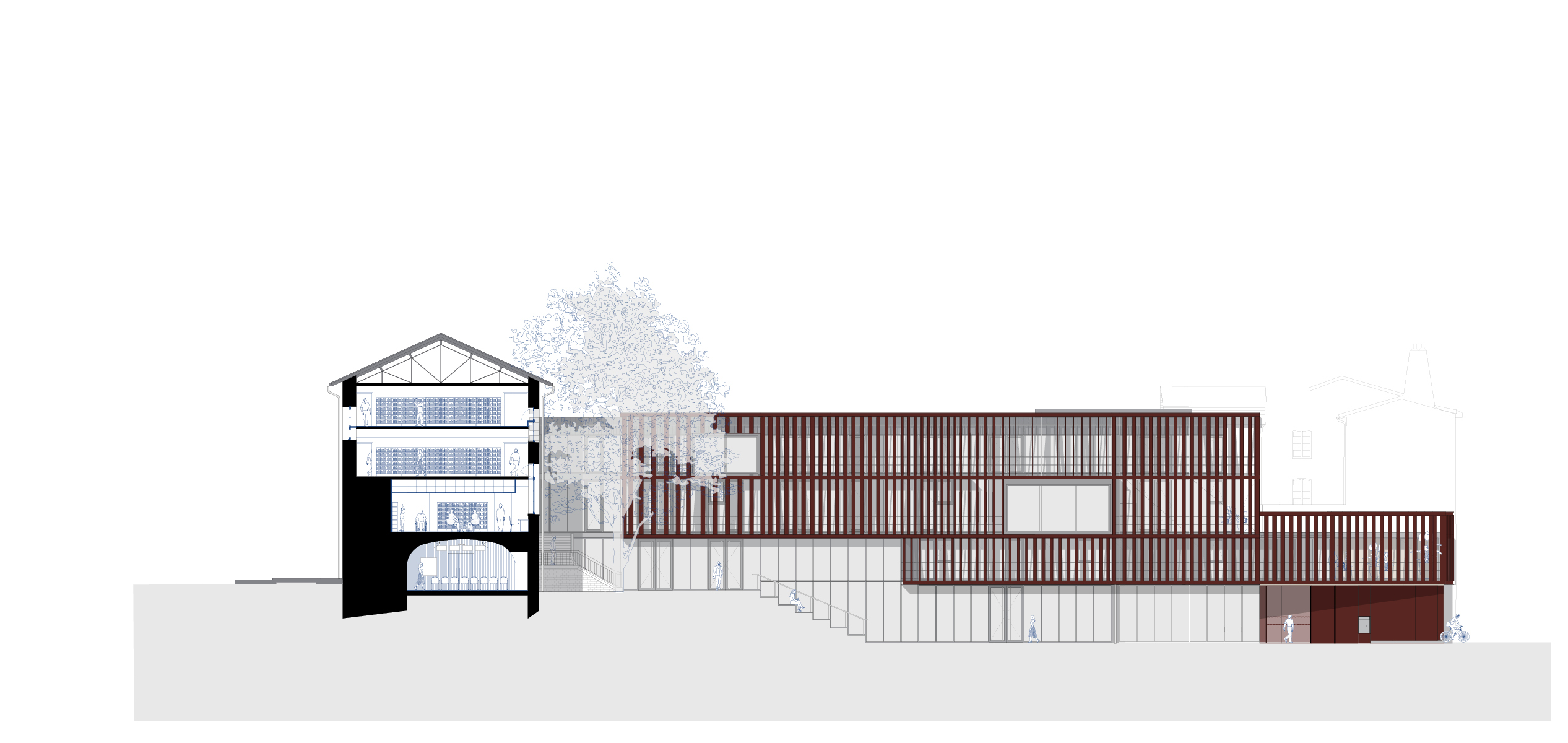 Remporté en 2018 à la suite d’un concours de maîtrise d’œuvre, notre projet entrecroise les échelles urbaines et architecturales. Il propose d’affirmer la présence urbaine de la médiathèque en surélevant et en créant une véritable place qui sert d’écrin ainsi qu’à la cathédrale. Reprenant les teintes traditionnelles basques, une façade métallique sert de filtre pour envelopper la façade et articuler les différents pignons. L’entrée principale est mise en évidence en la ramenant au niveau de la rue grâce à une lecture fine de la topographie. Un vaste hall, lumineux et en double hauteur, accueille les usagers. Les espaces de consultation sont ordonnés selon une progression montante des plus jeunes aux adultes et au très riche fond basque.